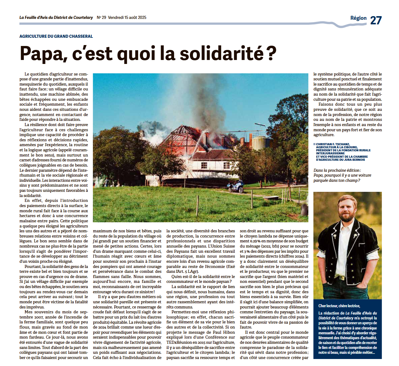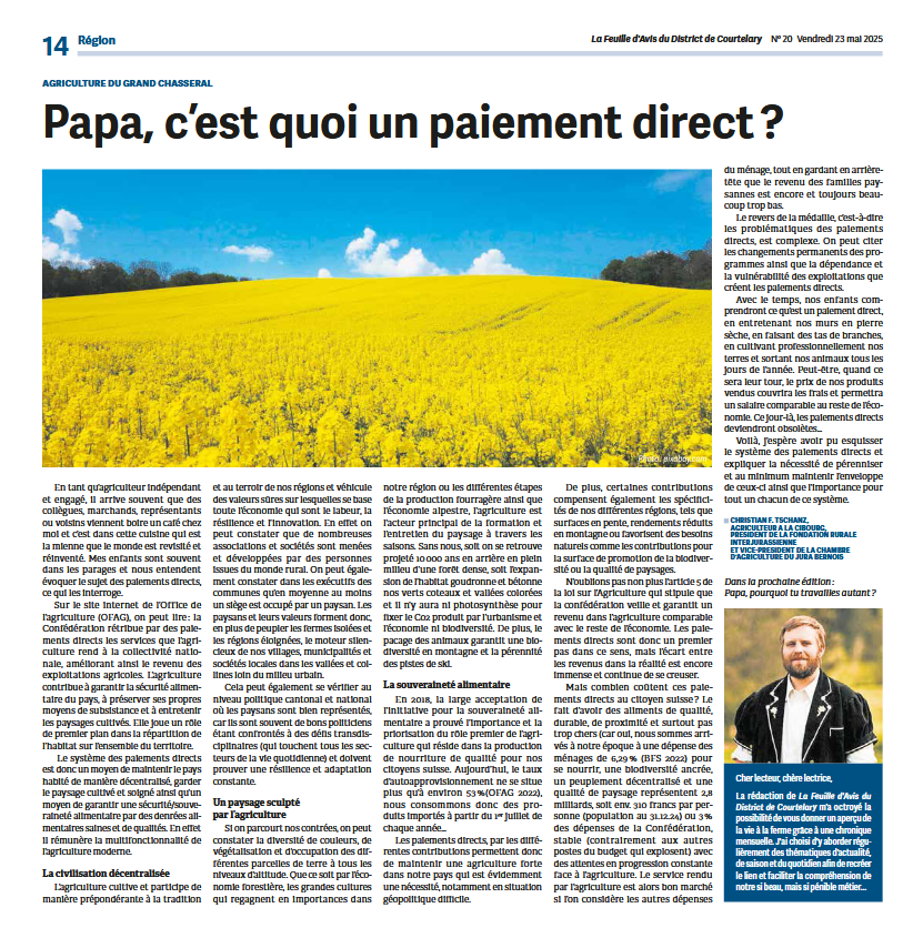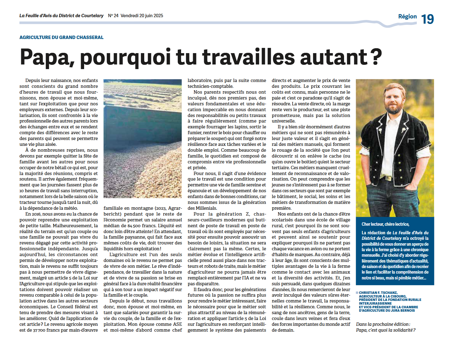 CHRISTIAN TSCHANZ chroniques Une fois par mois, je prend la plume pour exposer des thématiques en lien avec le monde paysan. À lire dans la Feuille d’avis du district de Courtelary.
